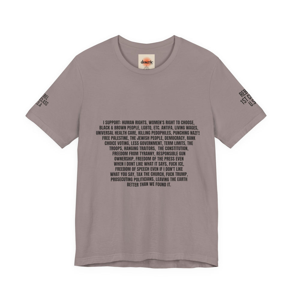 A soft, breathable tee that carries a quiet, principled voice. Made from Airlume combed and ring-spun cotton, this lightweight jersey sits comfortably against the skin and keeps its shape through everyday wear thanks to side seams, ribbed knit collar, and shoulder tape. The front features finely printed, typewriter-style that reads like a personal manifesto. Subtle sleeve prints add extra detail without shouting. Wear it layered under a jacket to a protest, it’s for people who favor freedom and they dont really care who lkwos it.